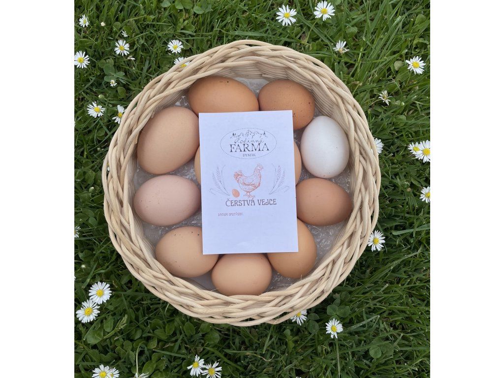 Čerstvá vejce z chovu naší rodinné farmy, od pasených nosnic přikrmovaných běžným krmivem.Vejce jsou netříděná, určená k přímé spotřebě v domácnosti.